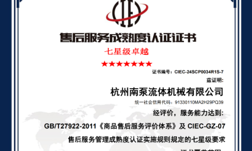 杭州南泵售后獲得《商品售后服務(wù)達(dá)標(biāo)認(rèn)證五星級(jí)證書》《售后服務(wù)體系管理成熟度認(rèn)證七星級(jí)(卓越)證書》等各類服務(wù)認(rèn)證